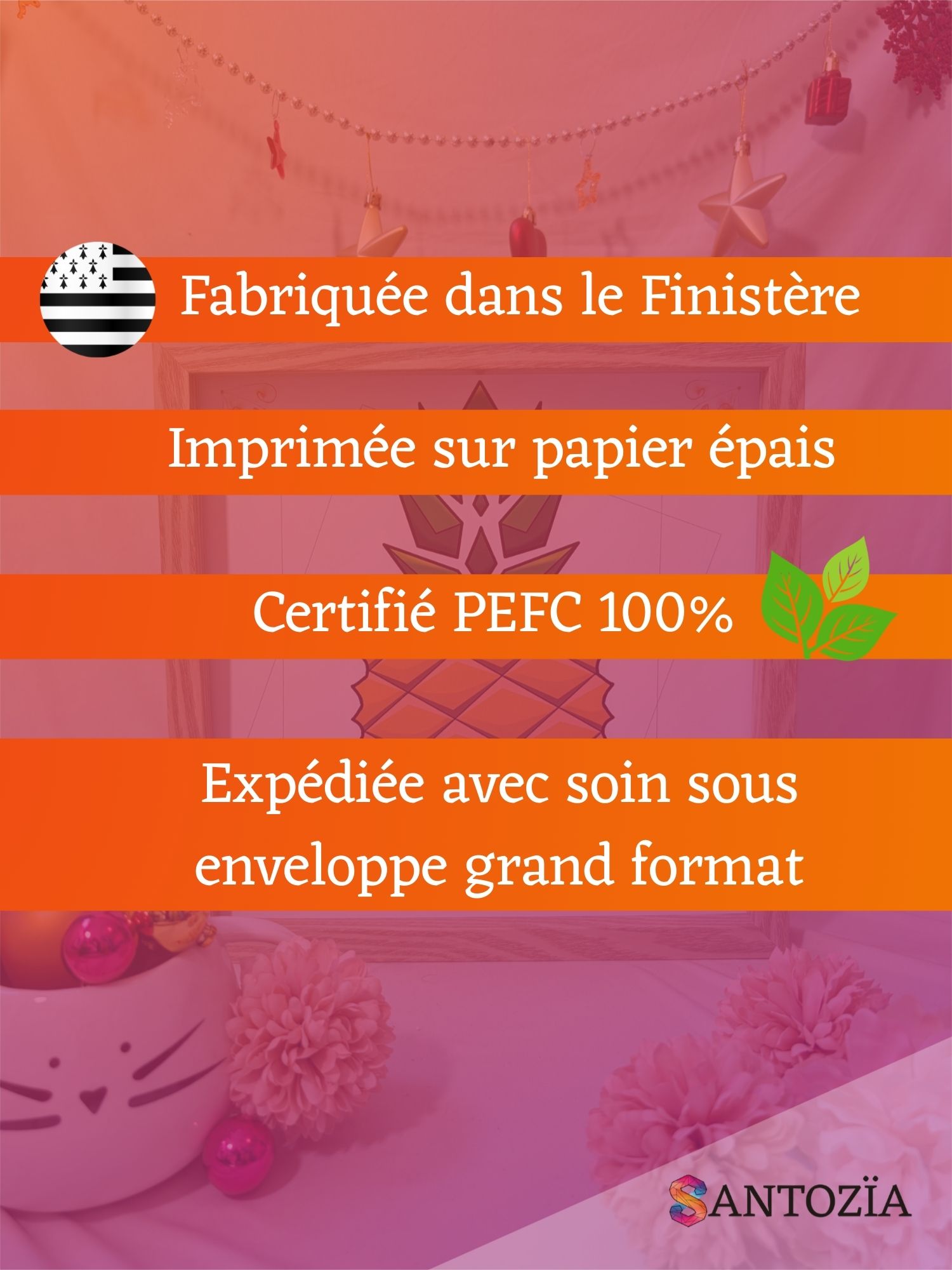 Comme toutes les créations Santozia, cette affiche est imaginée et imprimée en Bretagne sur papier mat 250 g/m² certifié PEFC. Les encres écologiques assurent un rendu durable et respectueux de l’environnement.