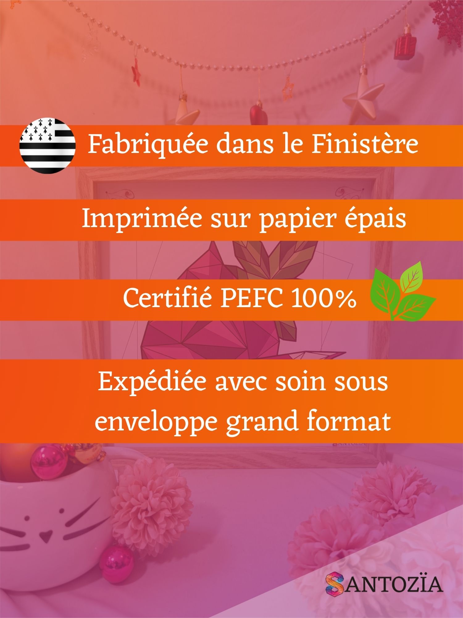 Comme toutes les créations Santozia, cette affiche est imaginée et imprimée en Bretagne sur papier mat 250 g/m² certifié PEFC. Les encres écologiques assurent un rendu durable et respectueux de l’environnement.